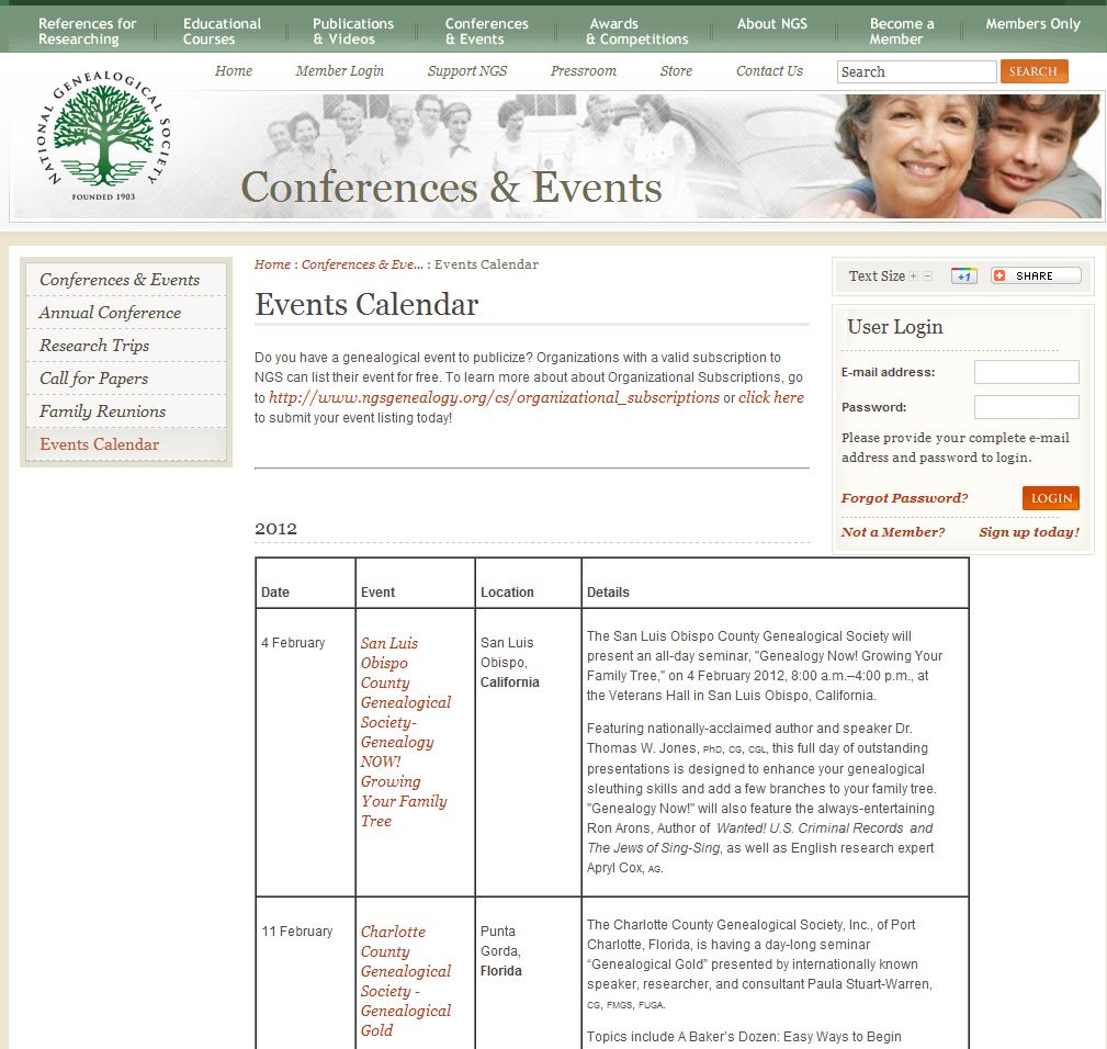 In January 2012, the National Genealogical Society (NGS) introduced a new format for their genealogical Events Calendar at the NGS website. The Events Calendar will now be presented in a table format that is easier to read and will allow the reader to scroll quickly down the list to find events of interest. The format, prioritized by date then event and location, will help make sure genealogists don’t miss an event that is important to them. NGS subscriber organizations will now have an easy-to-use “form” at the website that standardizes the information submitted for the Events Calendar so important details for an event are included in each submission. Now subscriber organizations have a more timely and flexible alternative to publicize their local, regional, and national events to the thousands of daily visitors to the NGS website. The online form that subscribing organizations submit can be processed very quickly and the Events Calendar can be updated within days, an advantage to organizations and to our members who want to stay current.